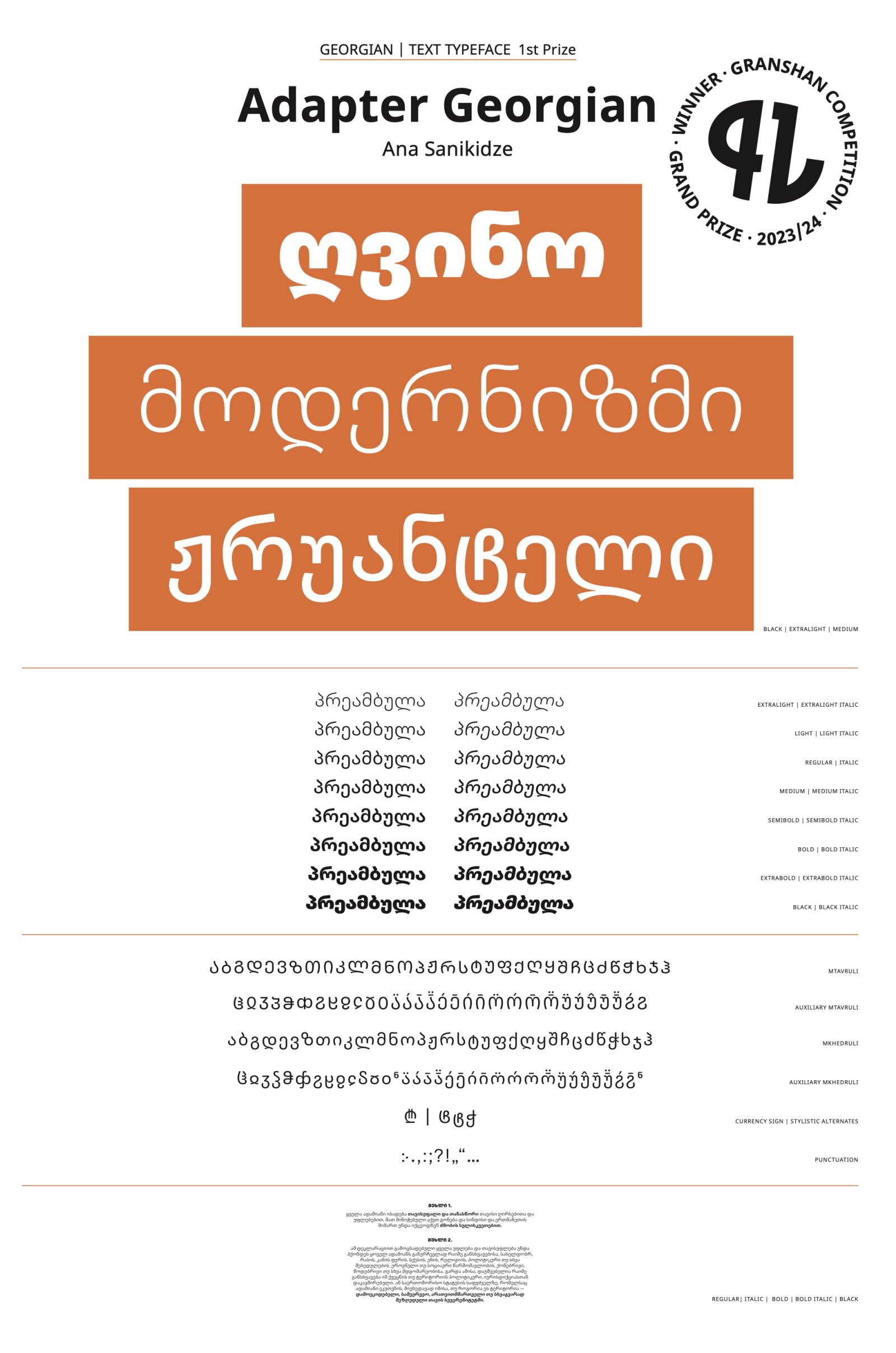 Adapter Georgian is an adaptation derived from an existing multiscript text type family, with a specific emphasis on ergonomics, even rhythm, and enhanced readability. Noteworthy features, such as accentuated elements, generous spacing, overall openness, and slightly squared counters, are meticulously crafted to excel at lower resolutions, prioritizing a gratifying reading experience. With Georgian-specific proportions, the typeface features extended ascenders and descenders, complemented by strategically placed ink traps, ensuring a seamless blend with other scripts in the type family. Tailored for extended reading in both print and digital mediums, this Georgian text typeface is adept at tackling contemporary challenges in Georgian typography. lowercase Mkhedruli letters and capital Mtavruli forms. Beyond serving the Georgian language, these fonts provide support for other Kartvelian languages, including Laz, Mingrelian, and Svan.