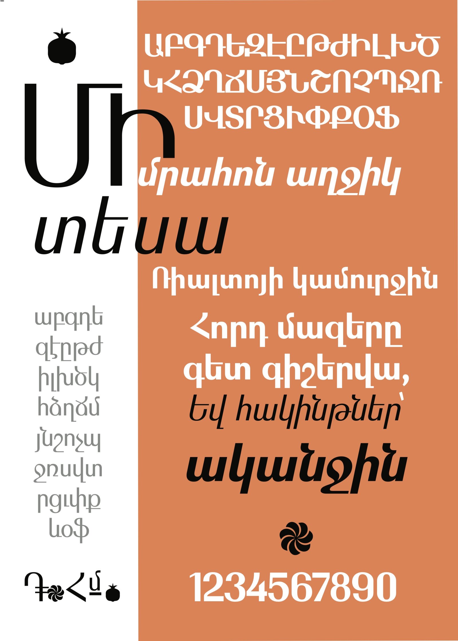 Rather nice text typeface with correct letterforms and proportions. Key dimensions are correct across all letterforms. The peculiarities of Armenian letters are preserved, the ascenders and descenders are executed in a correct size. Easy readable in all sizes and weights.
