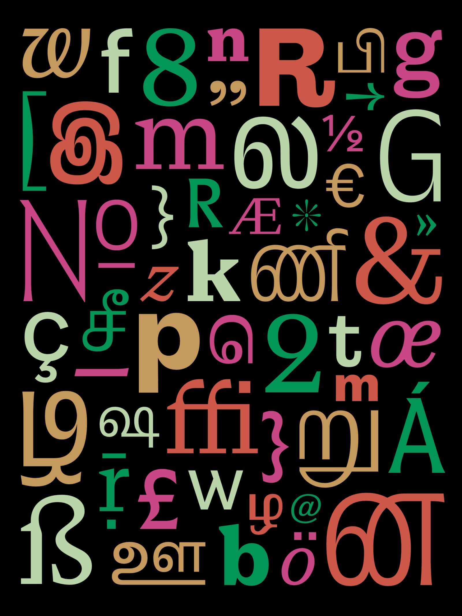 These text and sans styles are part of a larger family that also consists of a display style. The Latin & Tamil type family consisting of 3 subfamilies is designed to provide a rich typographic palette for editorial design. It questions the idea of optical sizes by proposing a display that is “same but different” from the text styles. The design space is inspired by typesetting of Tamil magazines which feature varied fonts in use in a single book. The modulated text subfamily is the basis of the 2 text subfamilies. This style does not tone-down the display but instead starts at a different point. It is a sturdy serif with wide proportions, generous curves and a fusion of varied references. The italic has vertical cut-offs on select terminals which is a take on Tamil’s italics being not a "true Italic" but more of a slanted style. The Sans is a grotesque that retains some of the peculiarities from the text style and the text duo is a nod to antique-grotesque pairs from 19th century.