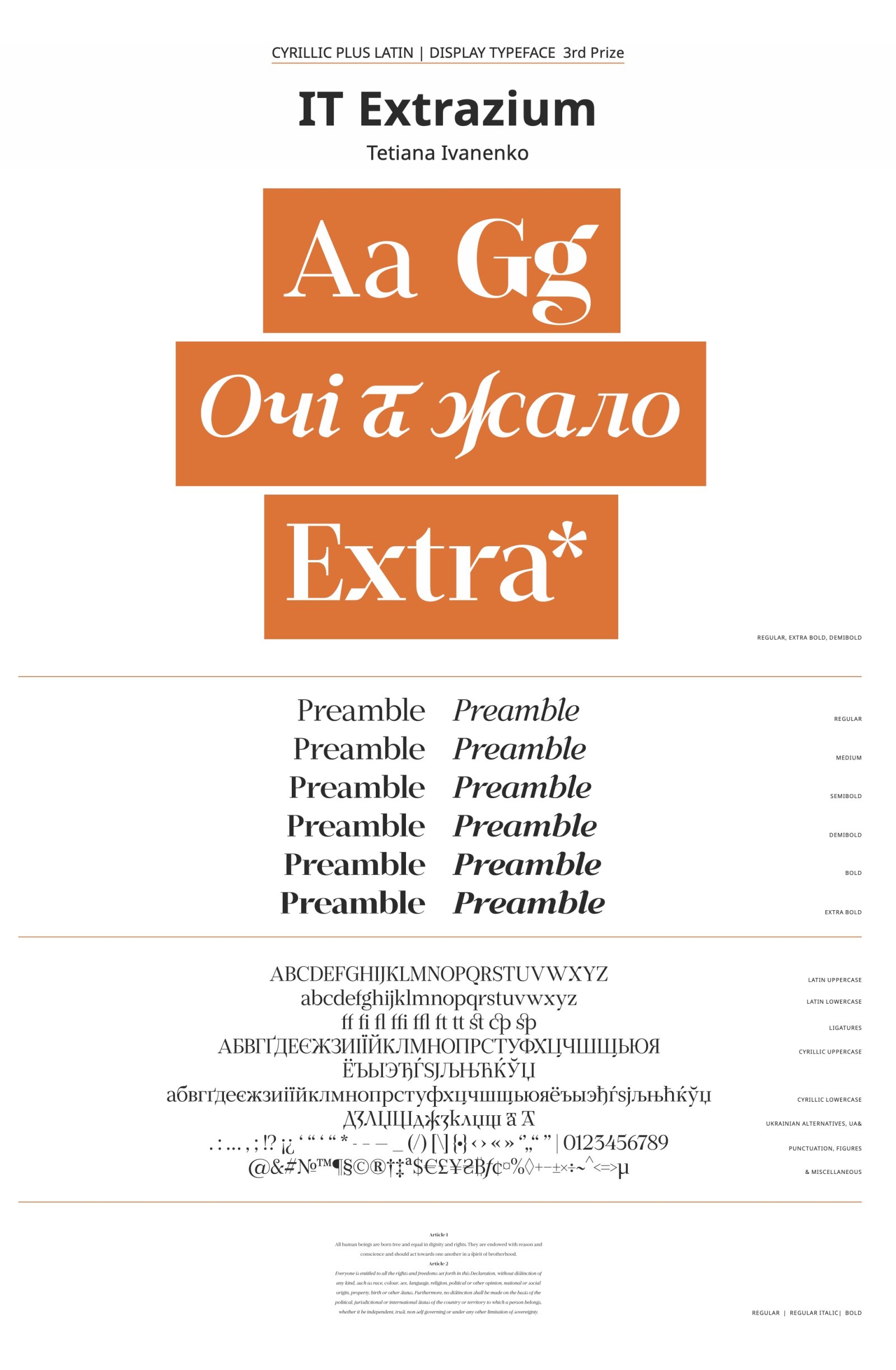 An elegant and slightly brutal, the font has all Open Type Latin Pro characters, Cyrillic, Ukrainian alternates + Experimental Ukrainian two- syllable ampersand for capital and lowercase letters (TA, та). The font has 12 styles normal and italic from Regular to Extra Bold. Supports change of punctuation depending on the case. 2022–2023