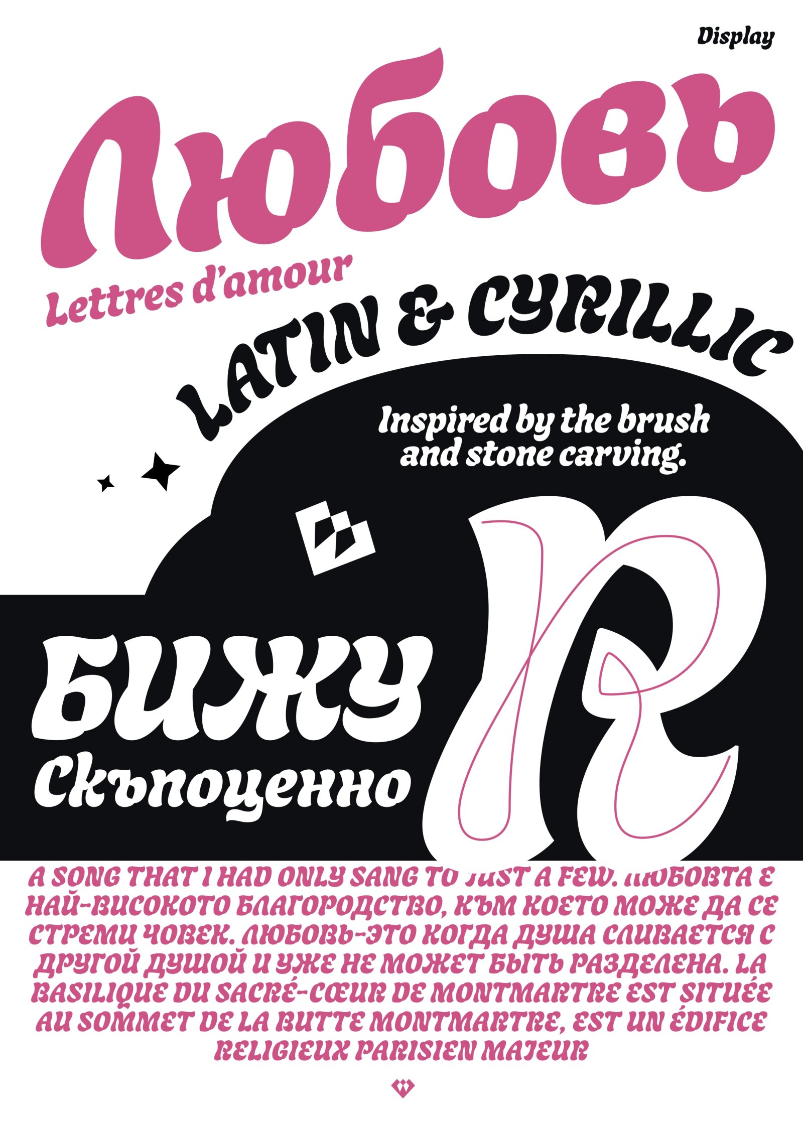 The typeface draws inspiration from the flat brush, highlighting its flexibility and the range of manipulations and rotations it enables. While calligraphy serves as the foundation, some referred to it as an ‘artificial brush,’ not because it truly is one, but due to its construction involving more pen lifts. Building upon this base, the design is further enhanced with hand-drawn elements. A distinctive characteristic is the ‘short overlap’ evident in the round letters, extending to the stems in a unique manner. During the process, the shapes in the Cyrillic enriched the Latin, and vice versa. The style is Bold, featuring a 10-degree slant that enhances its dynamic appearance, complementing the expressive shapes to achieve the desired outcome.