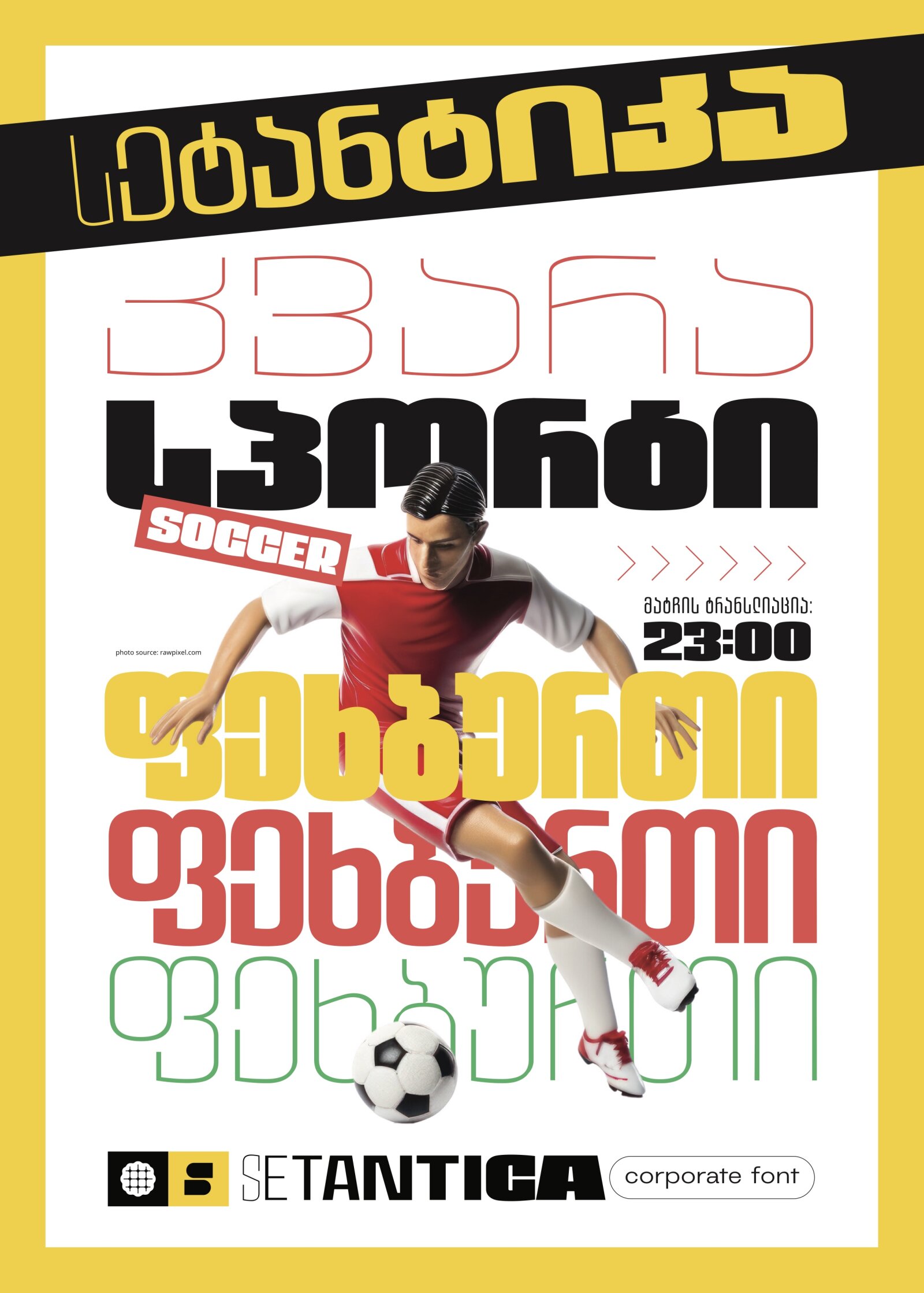 The concept behind this typeface revolves around a harmonious blend of athleticism and modernity. The font aims to capture the dynamic spirit of sports, translating it into a sleek and versatile design. Special attention has been given to ensure seamless functionality across various languages, promoting a global appeal. In terms of special characteristics, the typeface boasts elegant uppercase characters in Latin, Cyrillic, and Georgian scripts. The sharp lines and bold curves reflect the vigor of athletic movements, while the smooth transitions add a touch of fluidity.