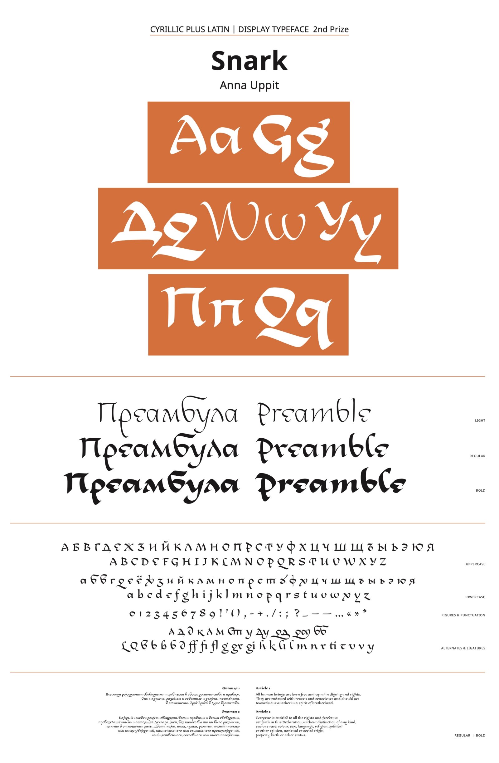 Snark is a calligraphic typeface based on the author’s interpretation of Russian unique script from the 16th–17th centuries which is called Skoropis’. Its name comes from Lewis Carroll’s poem “The Hunting of the Snark” and, like the poem itself, symbolizes the pursuit of happiness. The idea for the typeface was born during the study of historical scripts and calligraphic experiments with them. Skoropis’ is one of my favorite writing styles—bright, distinctive, and polyphonic, with wonderful graphic techniques that can work in modern design. Despite the typeface being a modern interpretation, it still retains the main features of Skoropis’. Snark works well in both large sizes and texts, and is particularly suited to poetry.