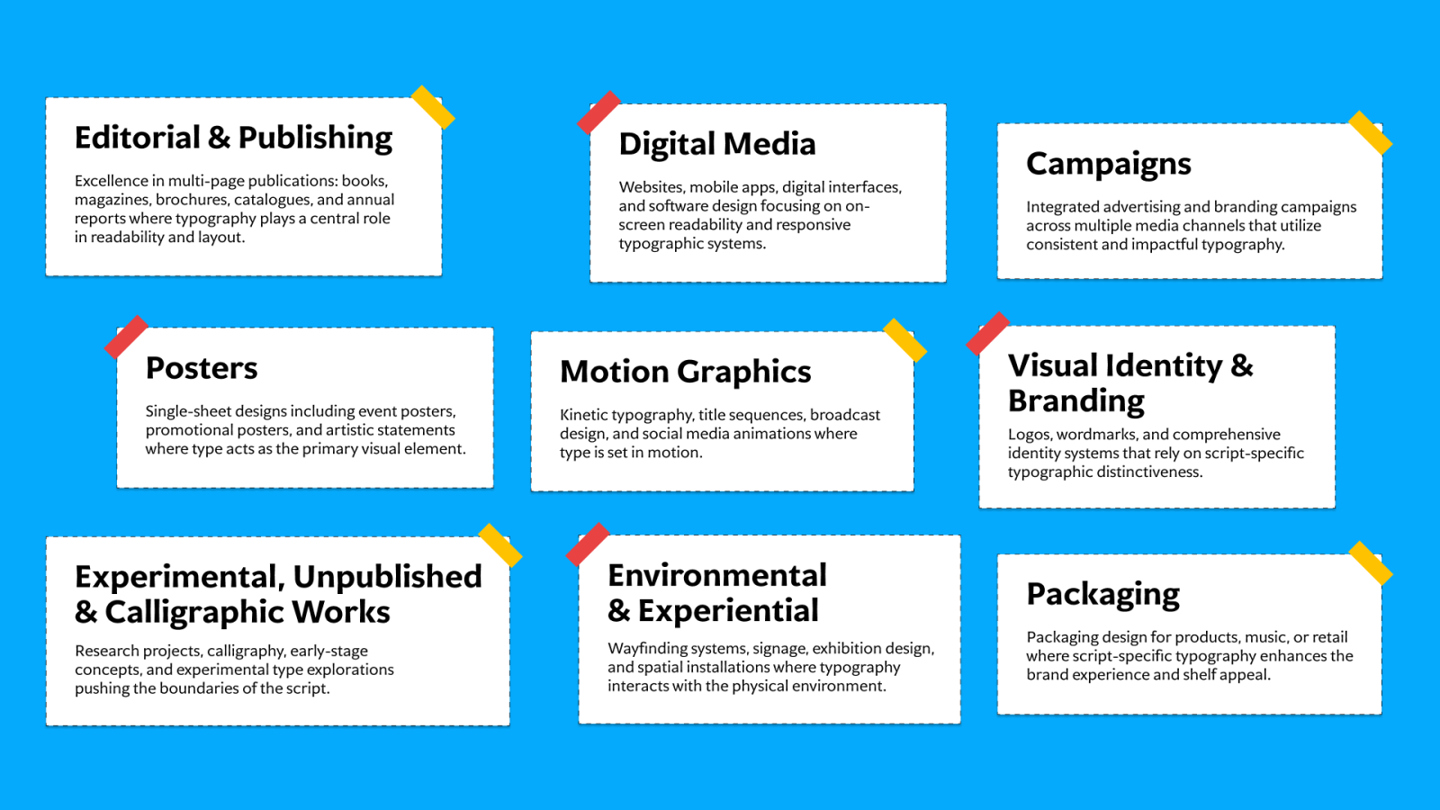 Media Categories define the format and context of your work. From editorial and posters to motion graphics, environmental design, and experimental projects, each category provides a dedicated stage for your typographic voice.
