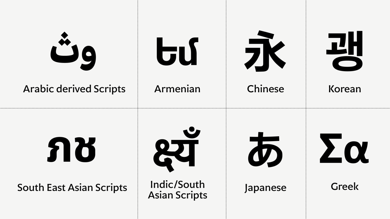 Arabic, Armenian, Chinese, Greek, Japanese, Korean, South Asian, and South East Asian scripts - with more to be added in future editions.